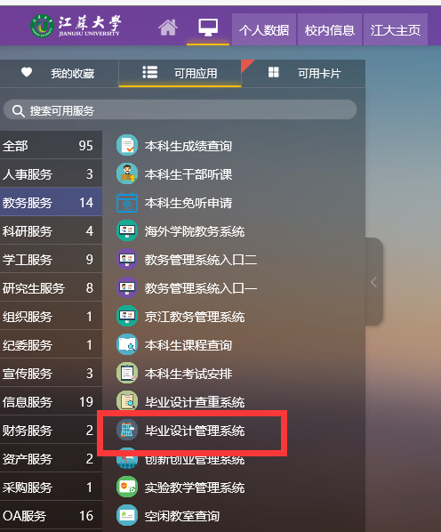 登录色情网站 综合门户,在“可用应用”菜单下-》“教务服务”-》“毕业设计管理系统”或者在搜索中输入“毕业设计管理系统”关键字。毕设系统不需要登录vpn,如已登录了vpn,请先退出再访问。为保证使用效果,推荐使用360浏览器。